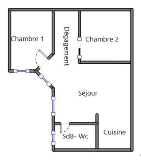 Il se compose d’une entrée, d’une pièce à vivre avec cuisine équipée, de deux chambres, d’un espace bureau, d’une salle de bains avec baignoire et WC